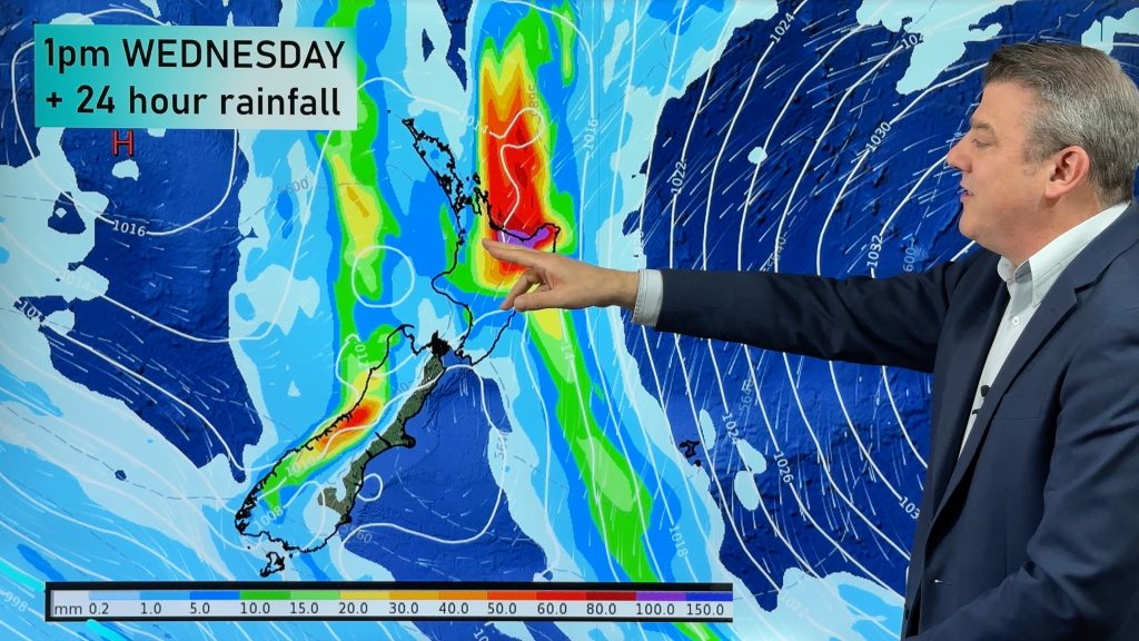 Around the country we see some heavy rain for the West Coast but also the opposite side of the country, up around Gisborne and East Cape as a low tracks by mid to late week there.